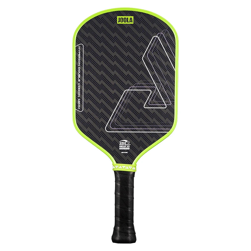 The Joola Hyperion Double Vision 16mm Pickleball Paddle is perfect for aggressive hitters, with its elongated length and tapered edge allowing players to hit fast and hard. Its textured, aramid surface enables spin generation to make winning shots even trickier to handle. A thermoformed edge wall at the neck provides extra stability and flexibility, while a special layer of SK Film between the core and hitting surface improves the sweet spot for more generous control.