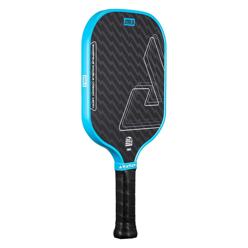 The Joola Scorpeus Double Vision 16mm Pickleball Paddle uses its wide surface and sweet spot to strike a balance between control and power.. Its textured, aramid surface enables spin generation to make winning shots even trickier to handle. A thermoformed edge wall at the neck provides extra stability and flexibility, while a special layer of SK Film between the core and hitting surface improve...