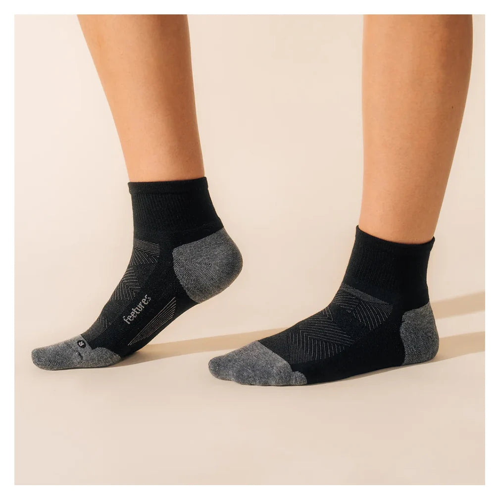 Get plush cushioning for added protection and support with the Feetures Elite Max Cushion Quarter Socks. Their quarter-length cut provides extra coverage for the ankles, minimizing chaffing against your shoes. An anatomical fit with targeted arch compression gives a custom-like feel, even with Max cushioning which provides added impact protection. Seamless construction at both the heel and toe offer a smoother feel when worn, and mesh-knit moisture-wicking fibers help your feet stay cool. Fit for all-day wear for any activity and occasion.