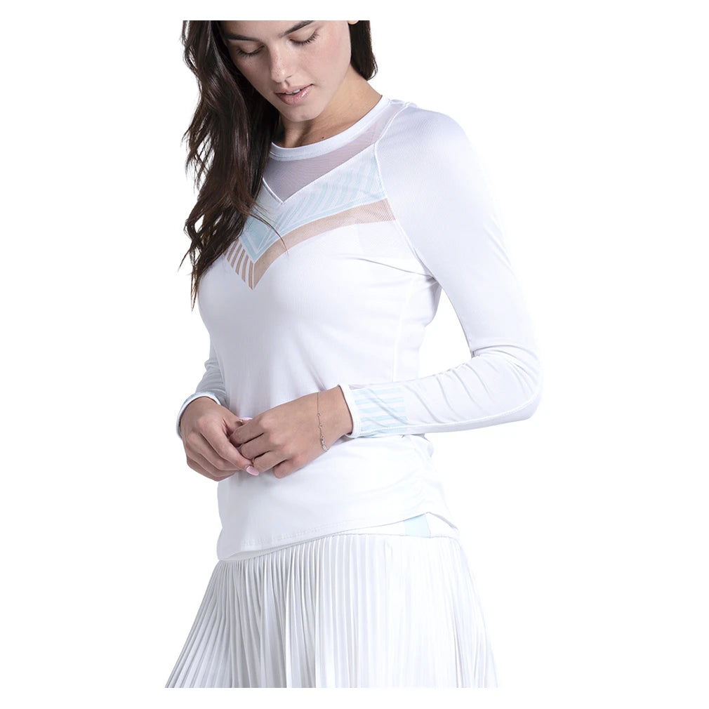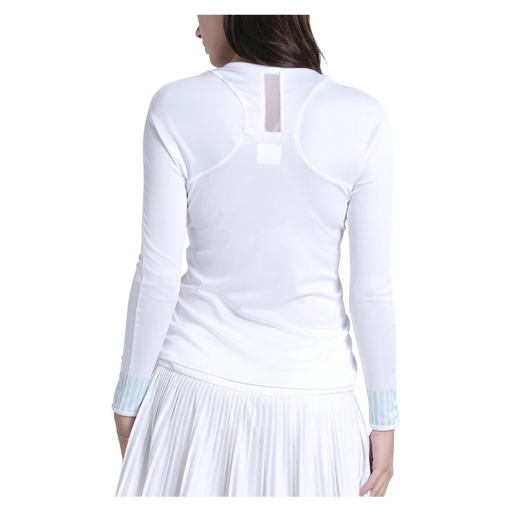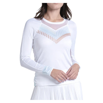 The Lucky in Love Women's Riviera Club Long Sleeve Top brings sophisticated elegance to sun protection with thoughtful design details. This stylish top features a high neckline with sweetheart detailing that adds a feminine touch to the athletic silhouette. Long sleeves provide full arm coverage for protection during outdoor play, while strategically placed mesh panels deliver targeted ventilation where you need it most. Ruched detailing on the sides creates a flattering gathered effect that adds visual interest and allows for comfortable movement during play. The breathable construction keeps air flowing throughout your match, preventing overheating during intense rallies. The combination of fashion-forward design elements and performance features makes this top perfect for players who want sophisticated style without sacrificing functionality on court.