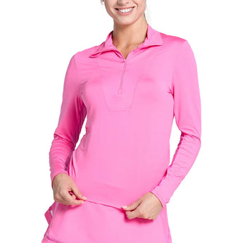 Freedom to move, protection to perform. The Lucky In Love Women's Free Play Zip Long Sleeve Court Top Taffy blends performance and style with its semi-fitted design and lightweight jersey fabric. Made from 88% polyester and 12% Lycra, it offers four-way stretch for ultimate mobility, while the zip-up neckline allows for adjustable coverage. With an SPF 50 rating, this top provides sun protection, keeping you safe during long matches or outdoor training sessions. Designed for comfort and durability, its machine washable and perfect for layering or wearing on its own. Stay covered, stay confident, and stay in the game.