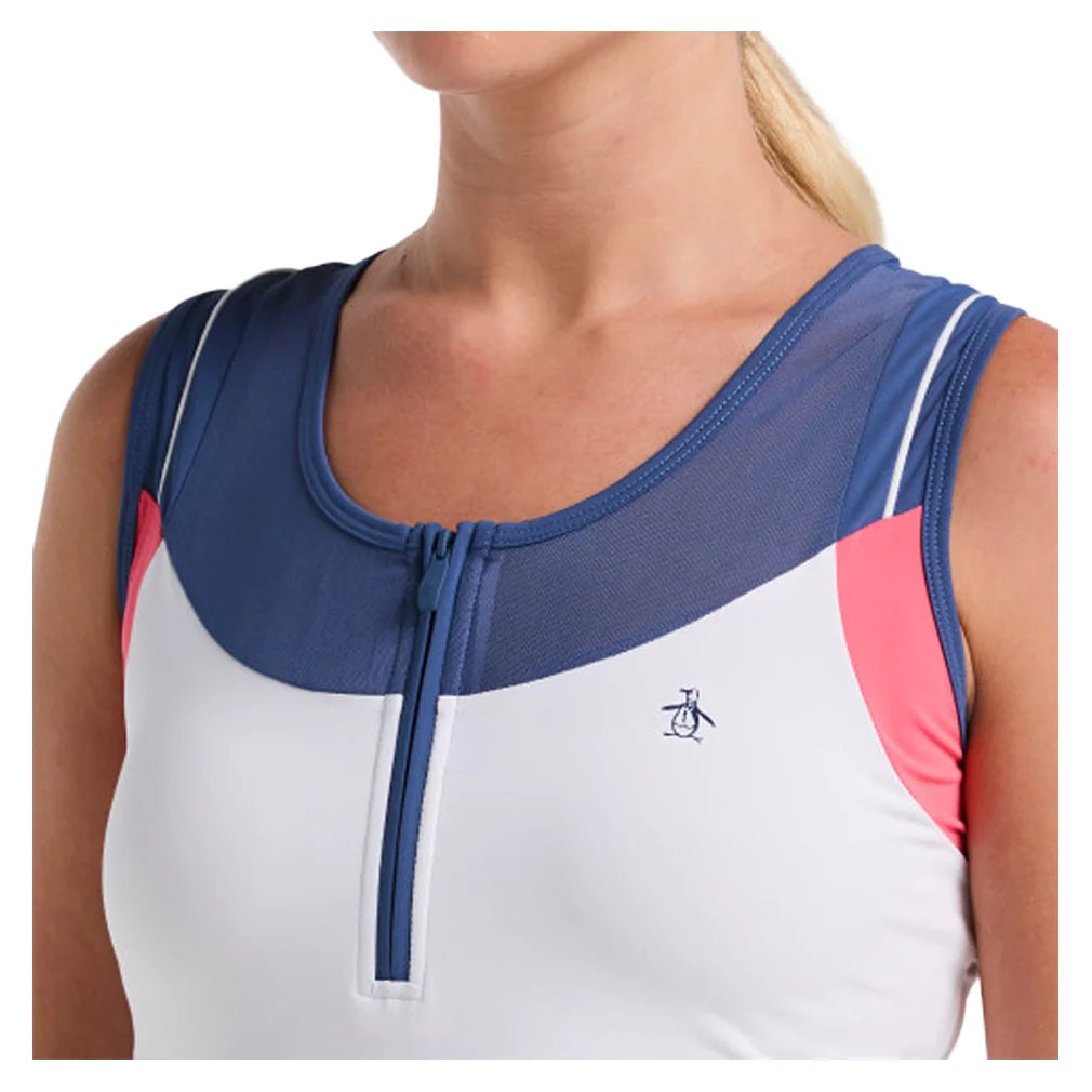 The Penguin Women's Color Block Court Tank brings sporty style to your court wardrobe. This performance tank features a modified racerback design that allows unrestricted shoulder movement. An adjustable front zipper provides customizable ventilation during play. A sheer mesh insert at the front neckline adds breathability and visual interest. The colorblock design creates a fresh, athletic look. Moisture-wicking fabric helps keep you dry from warm-up to match point. Finished with a Penguin logo at the left chest.